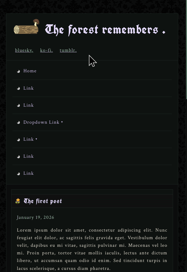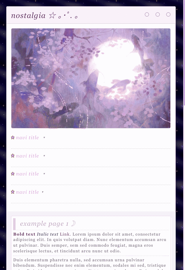 COMMENTS I named this layout "Nostalgia" because it strongly reminds me of the color themes of blogs from the 2010s. Responsive template made with flexbox and grid, only the calendar uses Javascript.