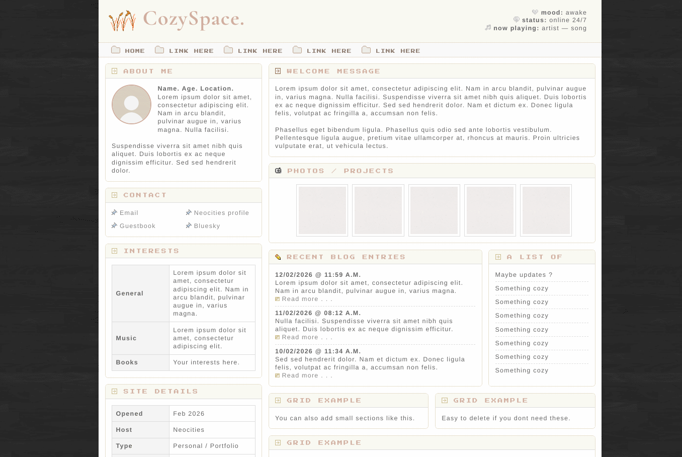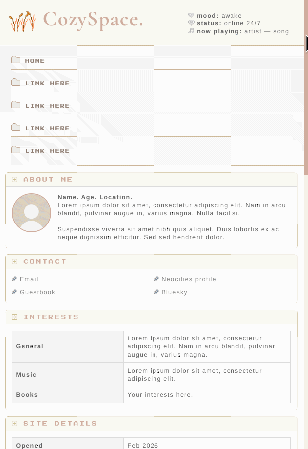 COMMENTS MySpace inspired layout. c: I'm currently obsessed to beige colour. This one has easy to edit colours with CSS variables.